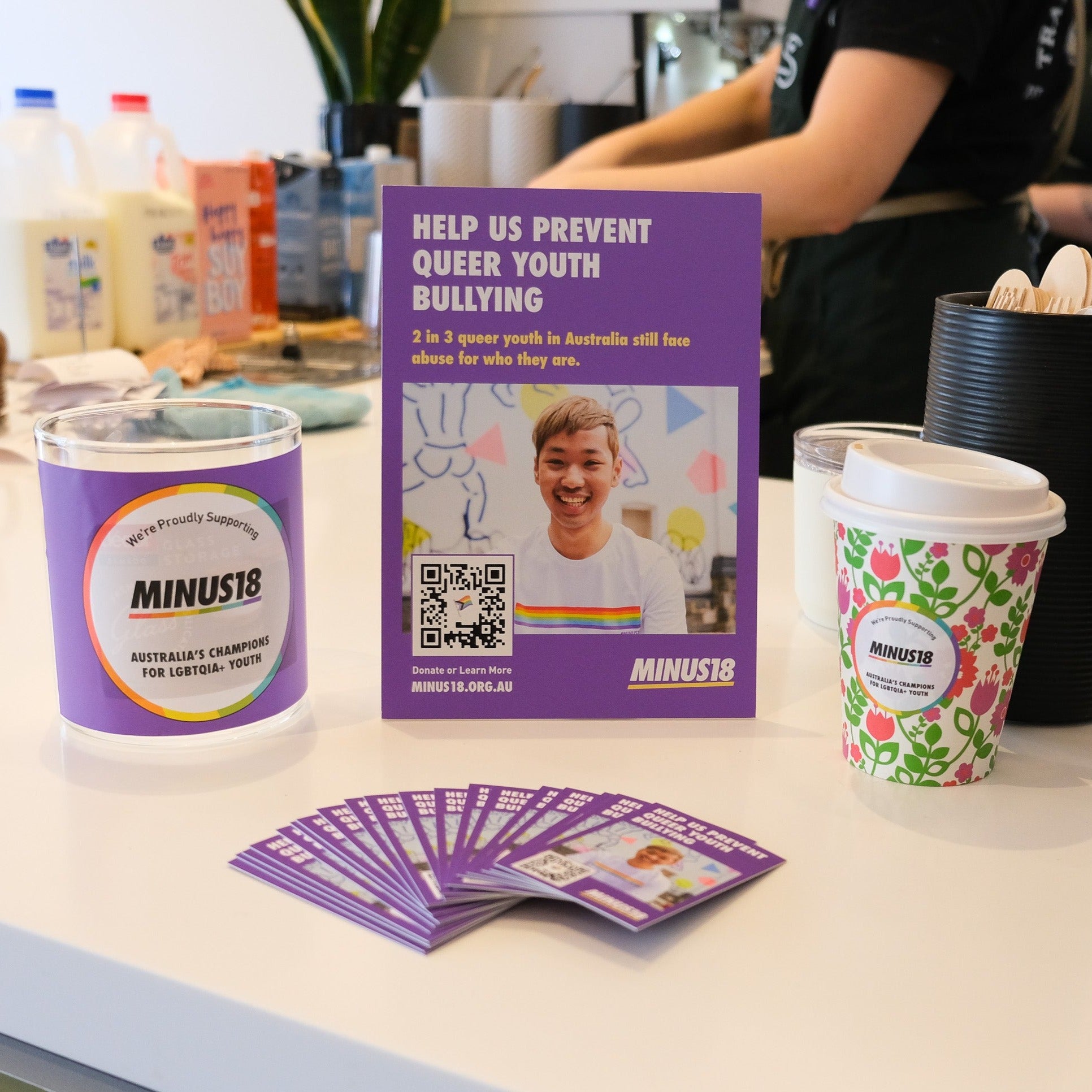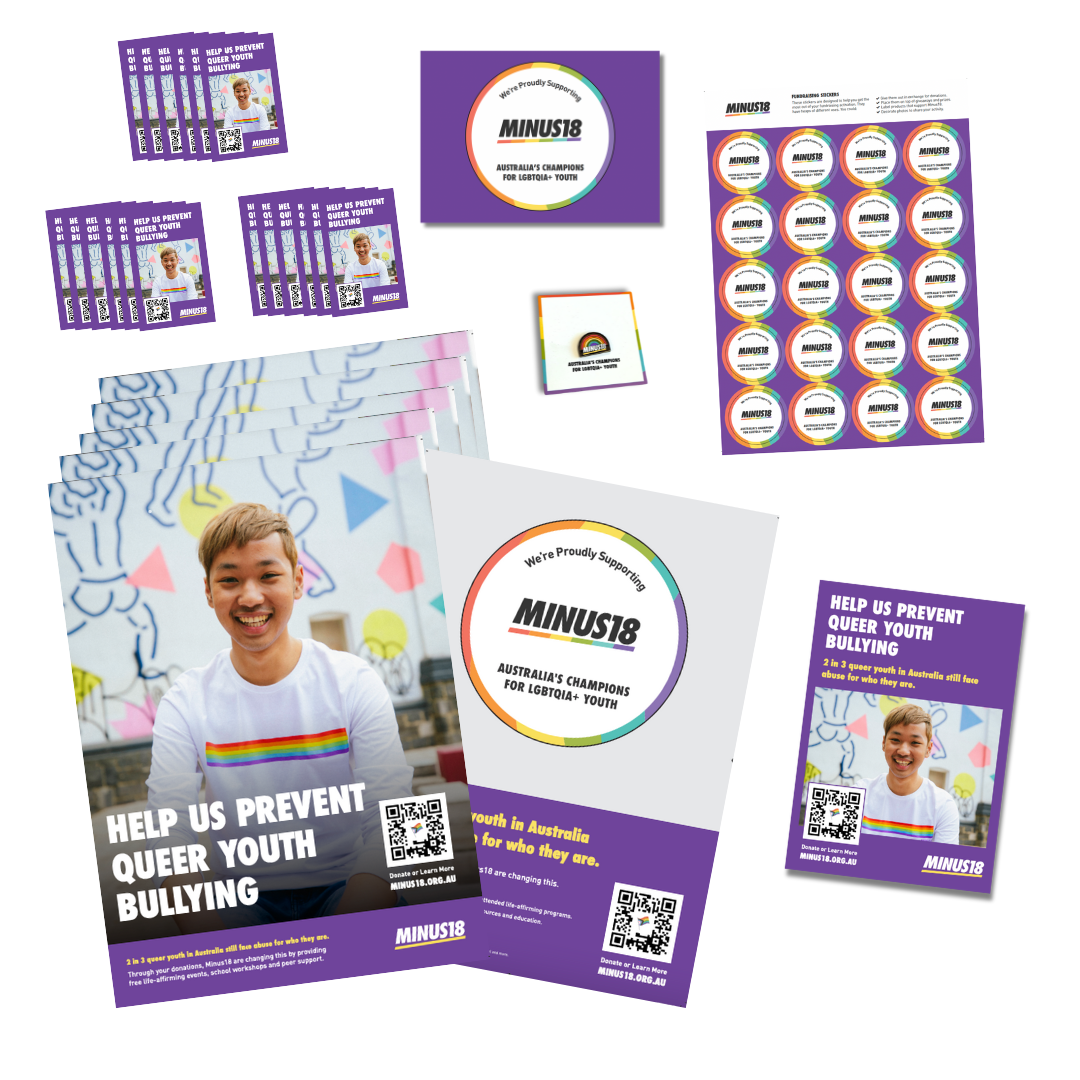 - 1x Strut Card: "Help us prevent queer youth bullying"