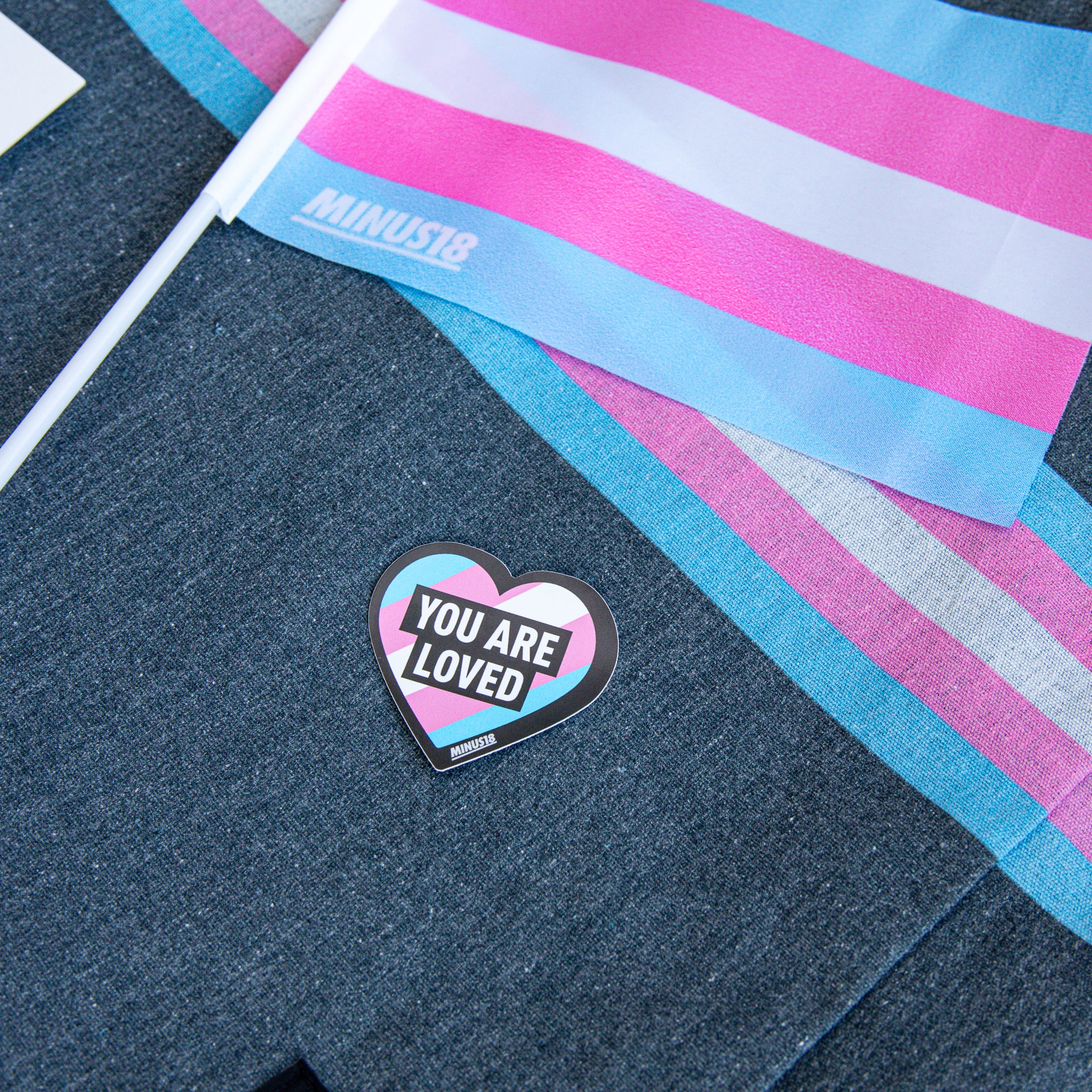 It includes your choice of a beautiful trans pride flag enamel pin, or a trans ally enamel pin.