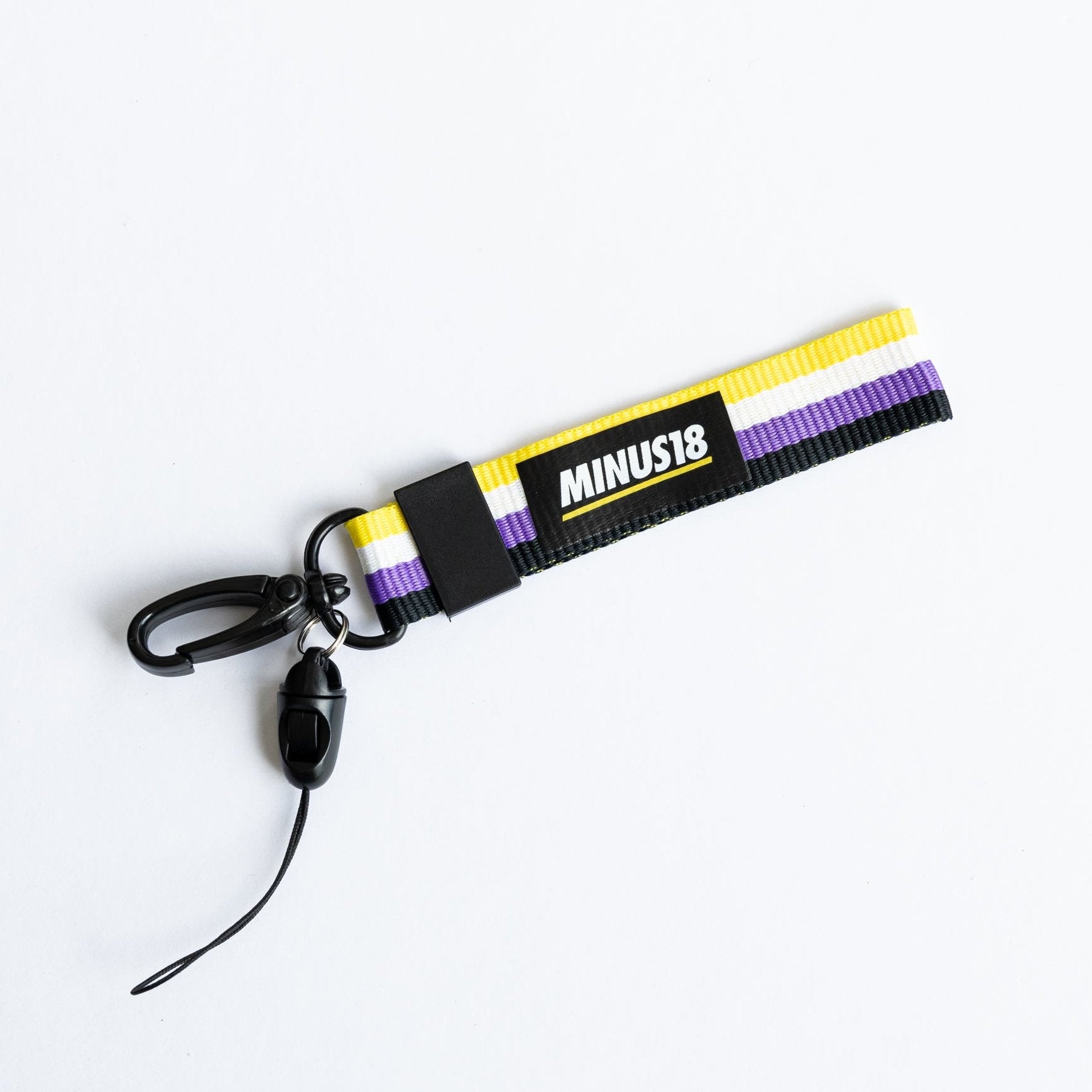 Show your pride with a Minus18 keyring, featuring the colours of the Trans Pride Flag.